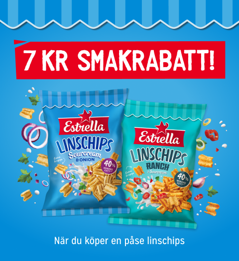 Nu har du chansen att få en rabattkupong på 7 kr rabatt som gäller vid köp av Linschips Sourcream & Onion eller Linschips Ranch & Sourcream från Estrella.
