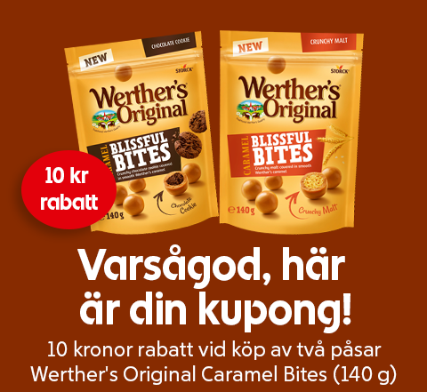 Du har nu möjlighet att få en sms-kupong på 10 kronor rabatt som gäller vid köp av två påsar Werther’s Original Caramel Bites (140 g).