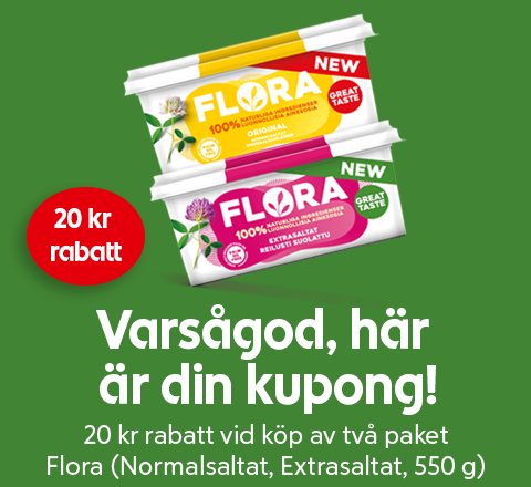 *Få 20 kronor rabatt vid köp av två paket Flora, normalsaltat, extrasaltat (550 g).